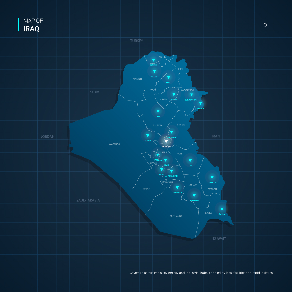 Iraq-based bases, warehouses, and workshops, supported by local talent and suppliers, keep teams, equipment, and materials close to your operations.